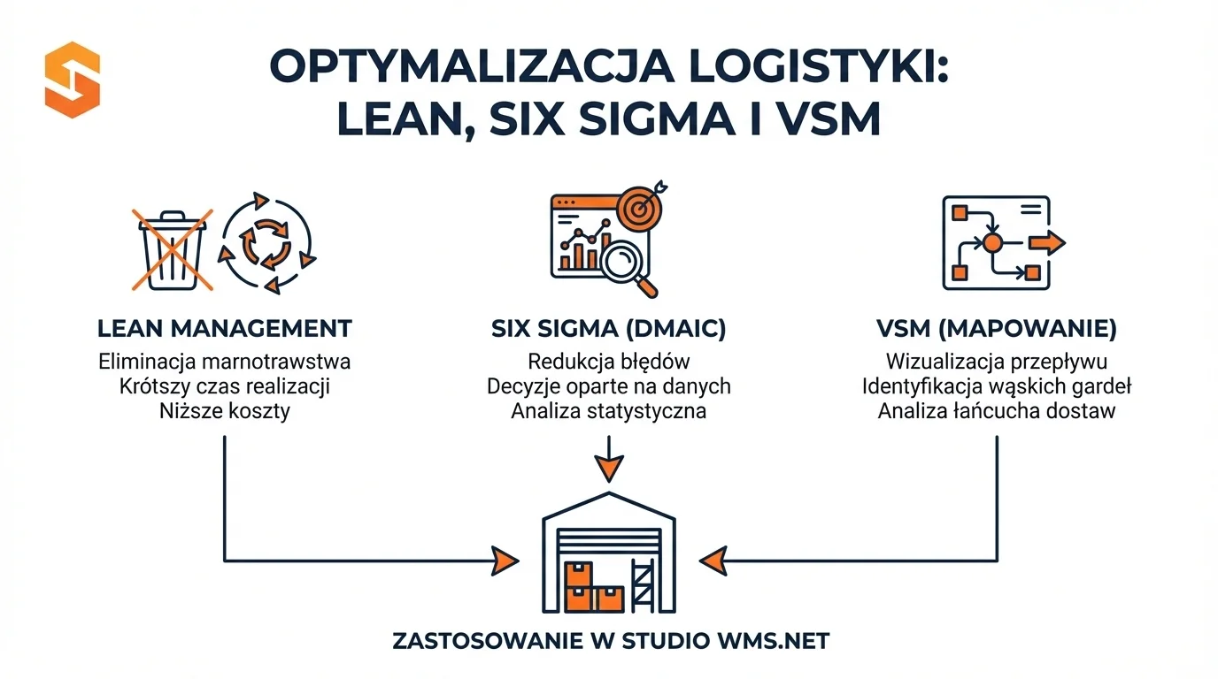 Infografika przedstawiająca Lean Management, Six Sigma i VSM jako metody optymalizacji w systemie Studio WMS.net.