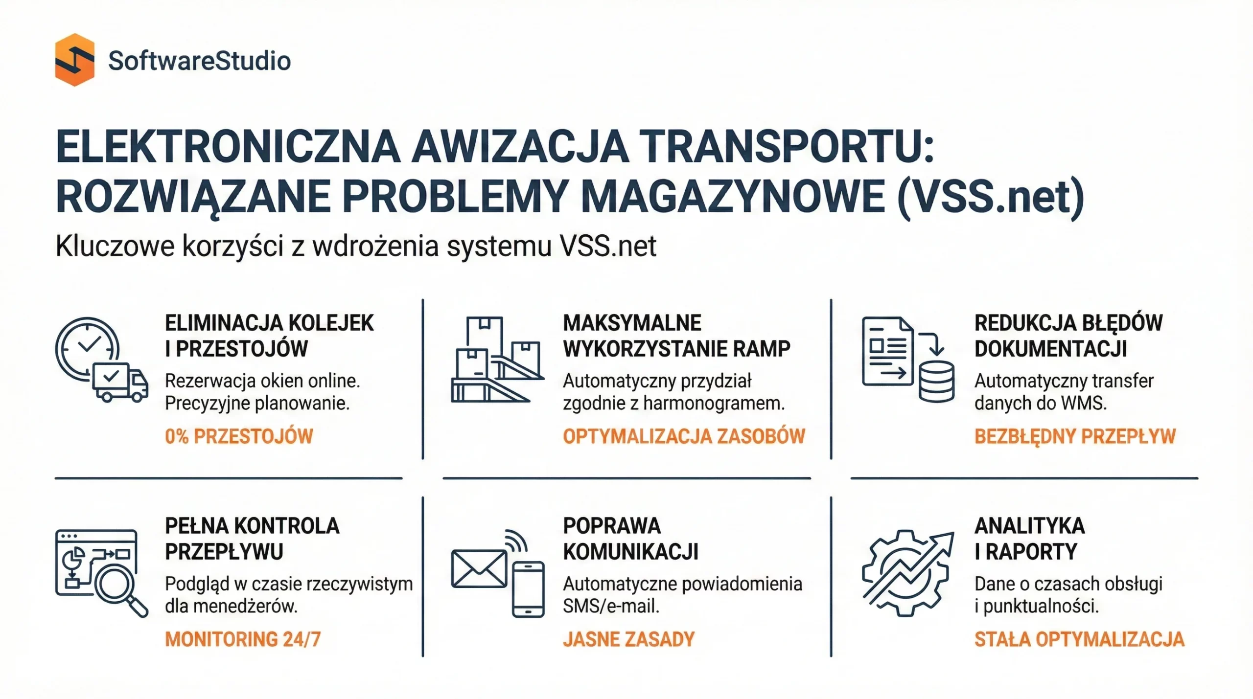 Tak, system VSS.net oferuje interfejs API umożliwiający integrację z systemami ERP, WMS oraz TMS, co pozwala na automatyczną wymianę danych o transportach. Dostęp mobilny umożliwia korzystanie z systemu na różnych stanowiskach: w biurze, magazynie oraz na placu manewrowym, co zwiększa elastyczność operacyjną. Automatyczna komunikacja wielokanałowa wysyła powiadomienia SMS i e-mail na każdym etapie realizacji awizacji, eliminując konieczność ręcznego kontaktu z kontrahentami. Studio VSS.net jest gotowe do przeprowadzenia prezentacji demo oraz szczegółowego omówienia wymagań technicznych i prawnych przed wdrożeniem.