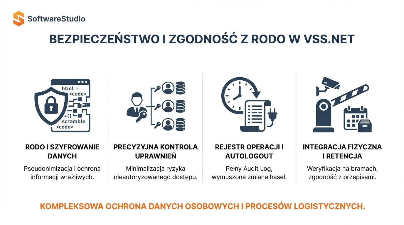 Nowoczesne systemy YMS, takie jak VSS.NET, są projektowane z uwzględnieniem wymagań RODO oraz ustawy o ochronie danych osobowych. Oprogramowanie stosuje zaawansowane mechanizmy zabezpieczeń, które chronią dane osobowe pracowników i kontrahentów przed nieautoryzowanym dostępem, zarówno za pomocą środków fizycznych, jak i elektronicznych.