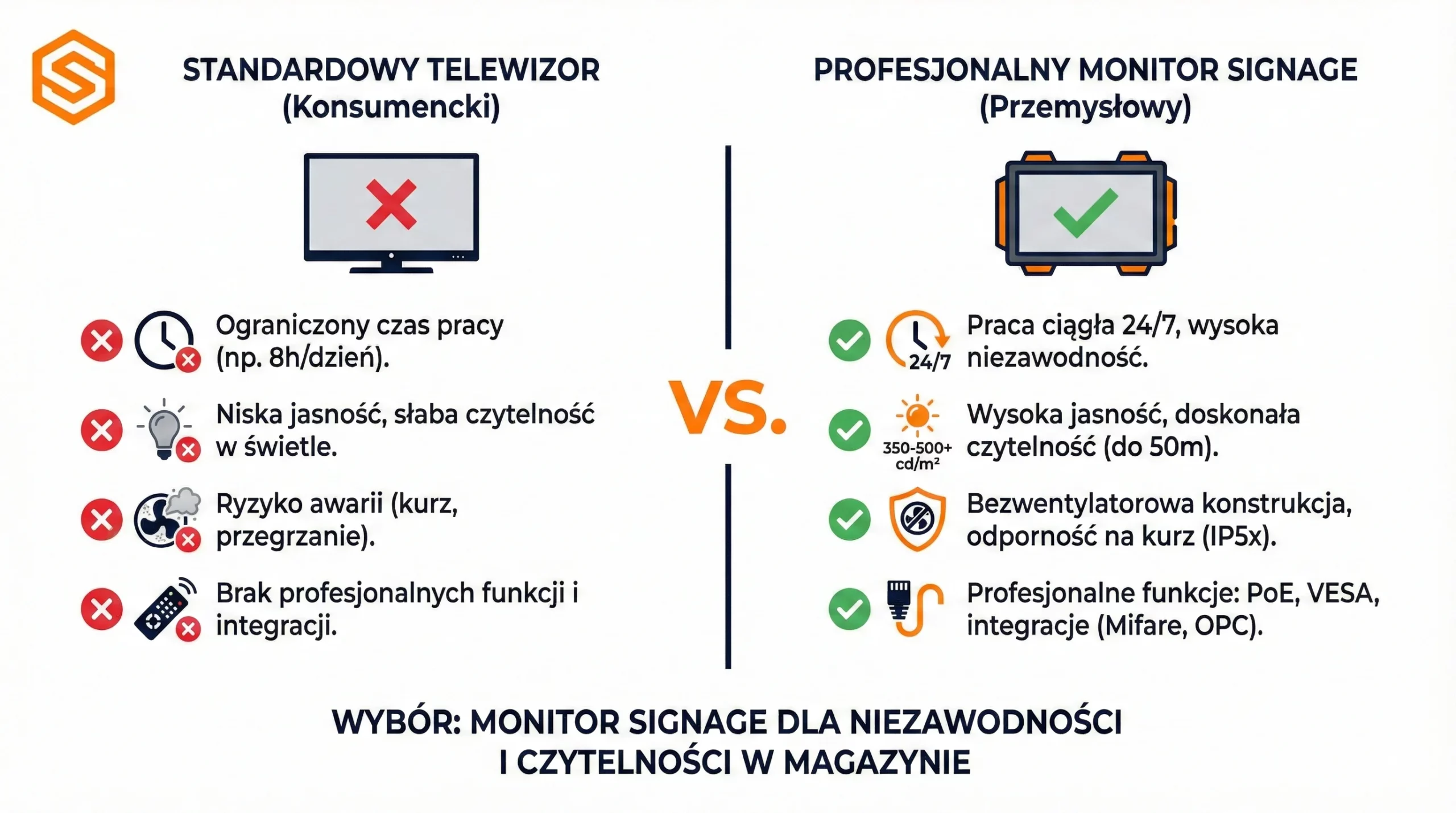 | Monitory Signage 24/7 (Samsung DC, LG UH) | Stabilna praca non-stop bez wypalenia matrycy | Awarie zwykłych monitorów po kilku miesiącach pracy ciągłej |